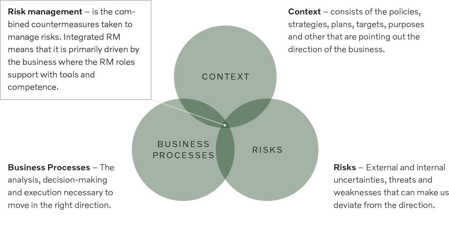 Enterprise Risk Management (ERM) is integrated in the business with an objective to improve decision making, proactively protect the fulfilment of strategies and plans and protecting our assets. The ERM also supports effective Business Continuity Management and transparency towards our external stakeholders. In addition, we want risk management to be driven by culture and leadership behaviours, integrated in our daily operation, and based on best practice way of working